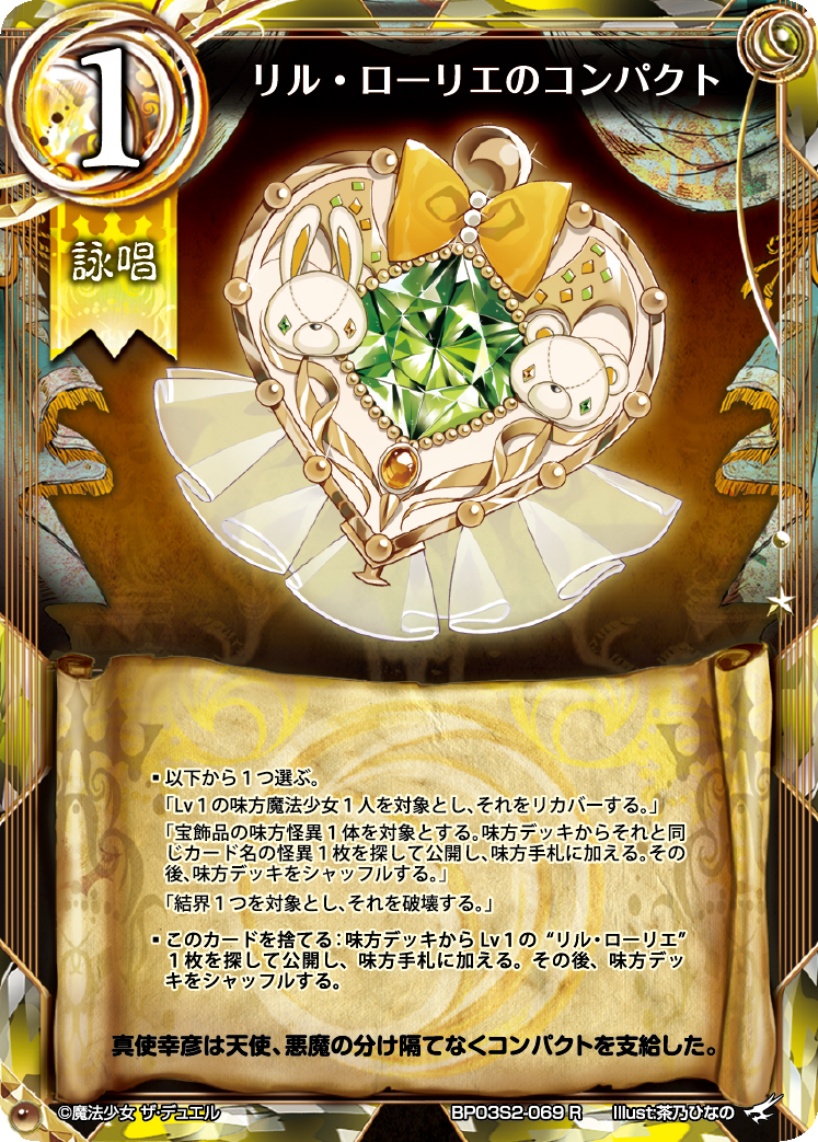 Choose one from the following. "Target 1 Lv1 ally magical girl and recover it." "Target 1 jewel ally monster. Search for 1 monster with the same card name from the ally deck, reveal it, and reveal it to your ally's hand. Then shuffle allies' decks. "" Target one barrier and destroy it. "